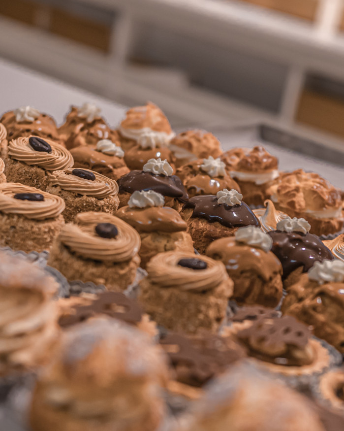 choux: choco, café, vanille, caramel beurre/salé, chantilly framboises